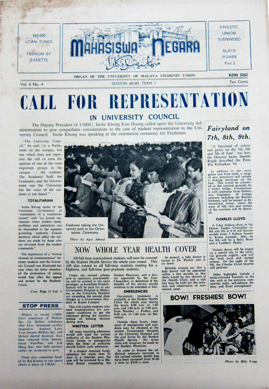 Mahasiswa NegaraAll students who entered UM were automatically a member of the students’ union. First-year students had to pay RM10 and second-year students RM8. By 1969, the union had a membership of 6,250 students and RM135,000 in the bank. Umsu had money to buy buses to manage their own transportation on campus, publish their own newspaper Mahasiswa Negara and Varsity magazine, run their own canteen, and organise all sorts of activities. All the societies and clubs received their funds from the students’ union.
