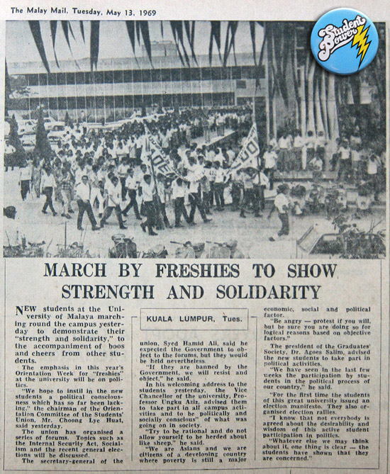 Yes, besides the elections, the students also ran the orientation programme themselves. It was a tradition for first-year students to march around the campus in solidarity, to instil “semangat perpaduan mahasiswa” in them. And look at the forums they organised for the first-years in 1969: “International students unrest”, “The ISA, which has weakened the opposition parties, is detrimental to democracy”, “Socialism as a solution to economic problems”, “Political parties and their objectives”, “Analysis of results of 1969 elections”.