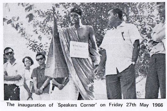 Press clipping: The inauguration of students' corner, 27 May 1966Ravee and his friends kept the speaker’s corner alive after that by having a session every Saturday at 10am without fail. Initially, it was just a space outside the library’s main entrance, but the next year they collected RM200 from the students and built a stage for the corner. That’s the history of the birth of the speaker’s corner, 100% by the students, for the students.