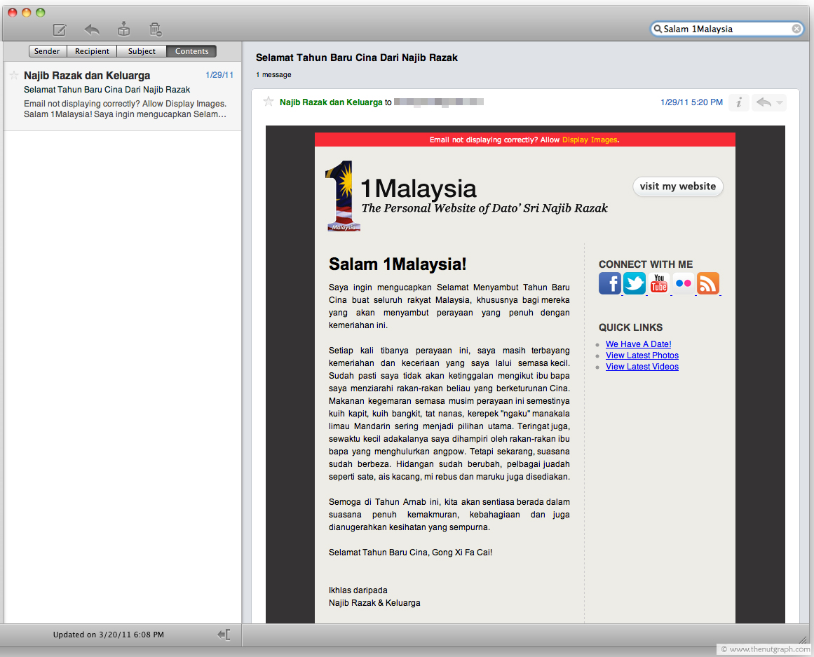 I received an email for CNY from Najib. Here’s the kicker: I’m NOT Malaysian (I’m American born and raised), I’m not Chinese, and though I lived in Malaysia for a year I certainly didn’t endorse 1Malaysia or Najib. So HOW did they get my email address?