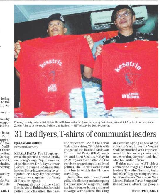 What was done: Illegal, illegal, illegal. News reports in The Star and New Straits Times simply assumed that the planned demonstration was illegal and reported it as such. They also reported Hishammuddin’s incredible declaration that Bersih t-shirts were illegal and the arrests of people in yellow t-shirts without any commentary on whether this had any legal basis.