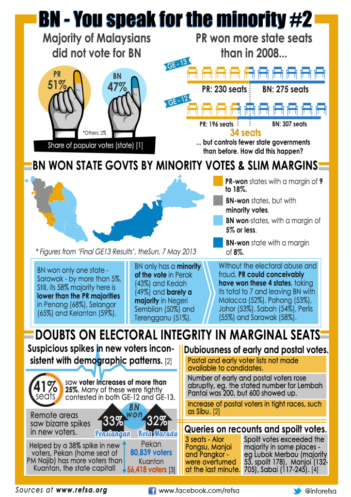 PAKATAN RAKYAT (PR) won only three states in the recently-concluded general election known as GE13, compared to the five it won in the 2008 elections. The Barisan Nasional (BN) secured more states this time around, winning back Kedah and Perak from the PR. In spite of this, Refsa’s analysis demonstrates that for the most part, the BN won these states by minority votes and slim margins.