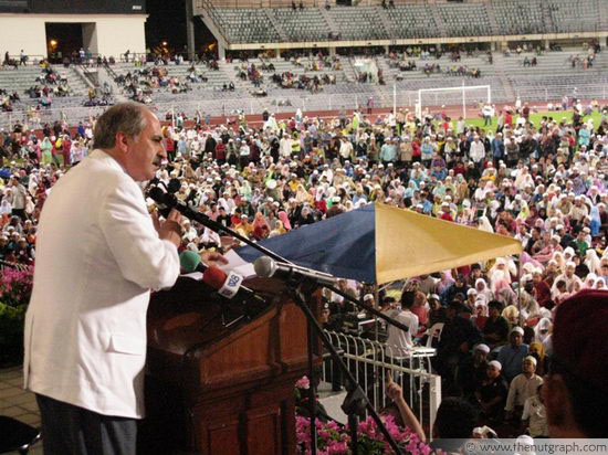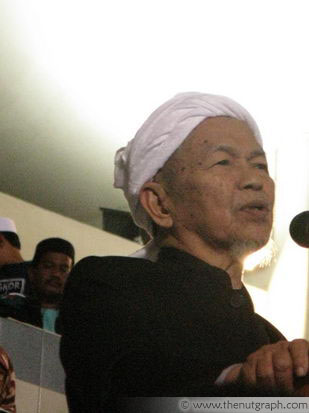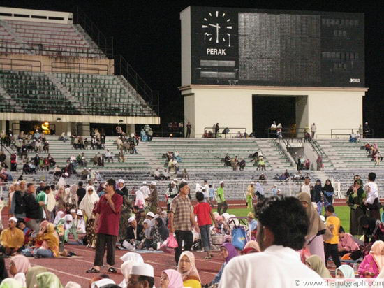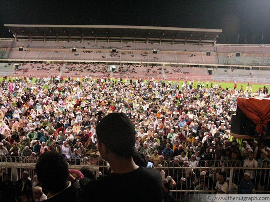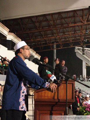 AFTER a long and tense day of debating the party president’s keynote address in the PAS muktamar, delegates and supporters gathered at Stadium Negeri Perak for the Ceramah Perdana on the night of 16 Aug 2008. By 9.30pm, more than 3,000 people had entered the stadium gates. Within an hour, the crowd grew to almost 10,000, with some families equipped with picnic mats and soccer balls for their little ones. PAS boasted some influential international speakers and guests from the Islamic parties of Pakistan, Tajikistan and Turkey. The closing ceramah was given by spiritual leader Datuk Nik Abdul Aziz Nik Mat. ![]()