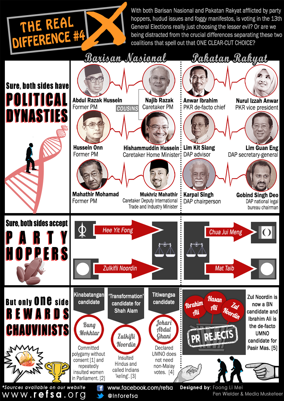 THERE are definitely similarities between the Barisan Nasional and Pakatan Rakyat when it comes to family dynasties and party hopping. But think tank Refsa points out at least one difference between both coalitions that should matter to Malaysia’s future as voters head to the polls today.