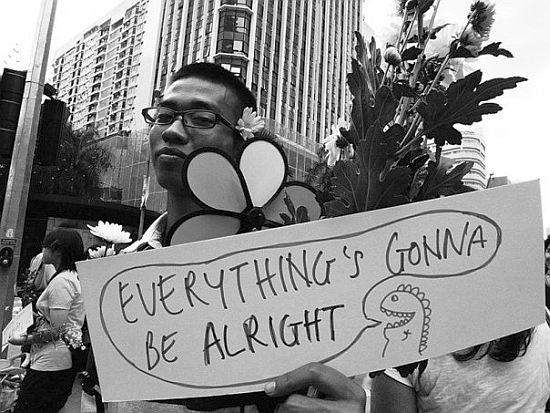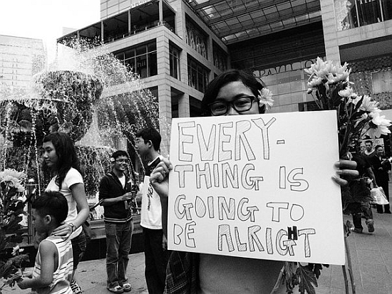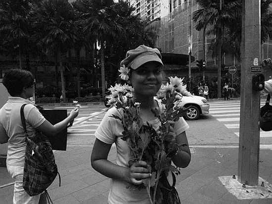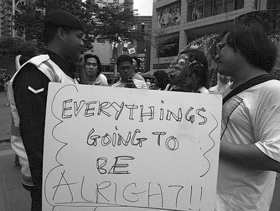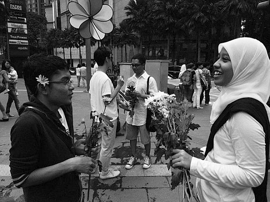 In the face of this discord, a group of young people banded together in Kuala Lumpur on Saturday, 9 Jan 2010, to spread a message of hope. They held placards that read “Everything’s gonna be alright”, and gave out flowers to passersby in the busy Golden Triangle district of Bukit Bintang.
