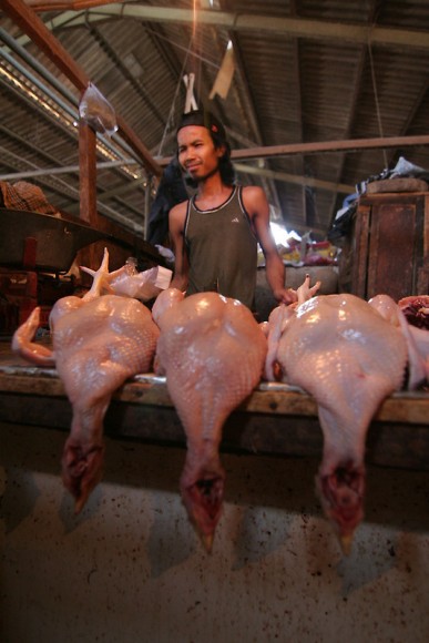 This young man sells whole chickens in a small market in Jakarta, Indonesia. They are laid out and de-feathered, not plastic wrapped or on ice, for potential buyers to examine. November 27, 2010
