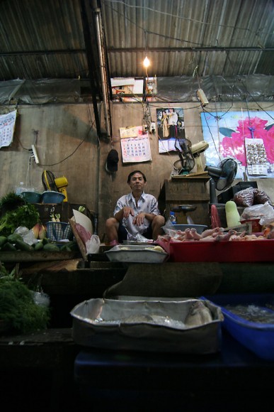 Hidden down a back alley, this man is like a king on his throne. In front are fish and above are chicken parts. This market in Bangkok, Thailand has a unique smell. November 27, 2010
