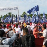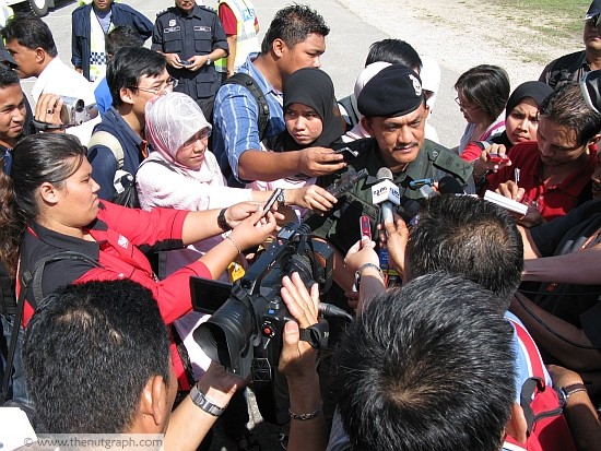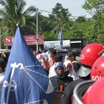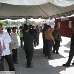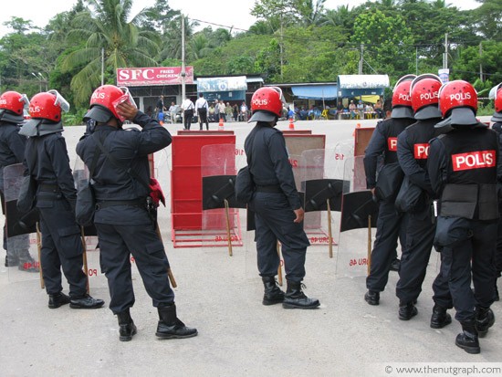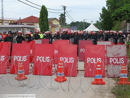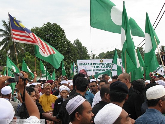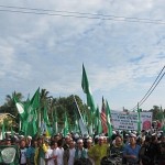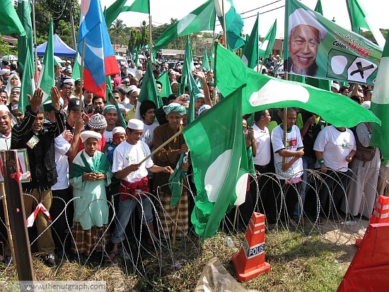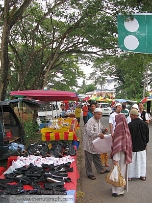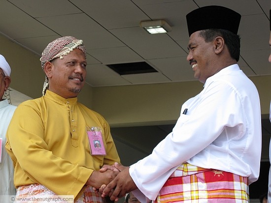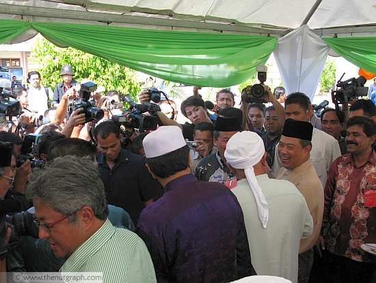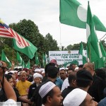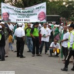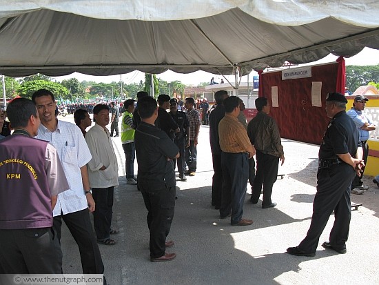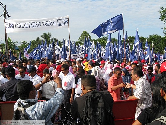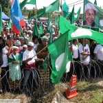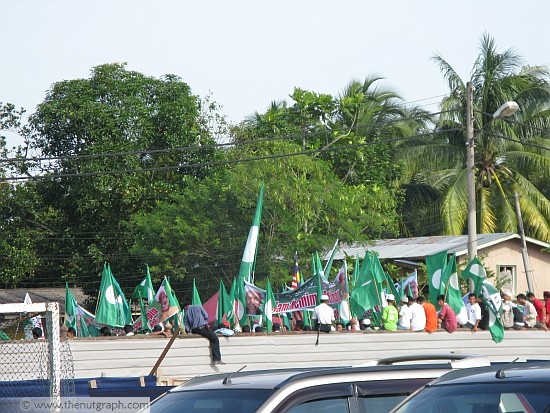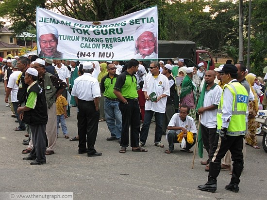 Nomination, held at SMK Sultan Yahya Petra (1)’s Dewan Petra, began at 9am today, although supporters from both camps arrived much earlier. PAS supporters, over 10,000-strong, marched from Jauhar Mosque in Guchil. The BN crowd, at over 2,000, marched from their coalition headquarters in downtown Kuala Krai.