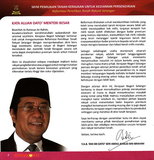 As a starting point, let us look at the official booklet on the leasehold renewal programme published by the Selangor Menteri Besar’s office. In his opening address, Khalid said the following in the third paragraph: