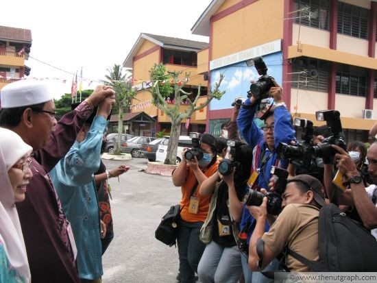 As neither PAS’s Mohd Salleh Man nor the Barisan Nasional (BN)’s Rohaizat Othman — the rival candidates — is registered to vote in Permatang Pasir, the media’s attention was turned to Anwar. He voted at Sek Keb Seri Penanti in Kubang Semang together with his wife, Parti Keadilan Rakyat president Datuk Seri Dr Wan Azizah Wan Ismail. They were accompanied by Salleh, who, from there, continued on a tour of all polling stations to greet supporters and voters.