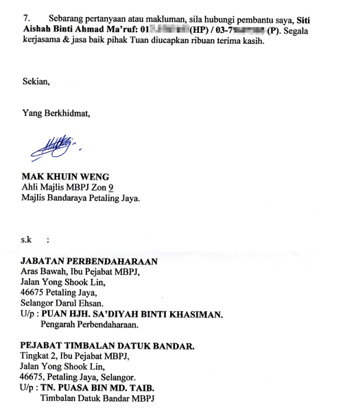 Deputy Mayor Puasa Md Taib replied a month later, with a new cheque attached since the first one had expired. He stated that there was nothing wrong with the payment because I was considered a member of the billboard sub-committee “formed” in October 2008, which essentially had the mandate to conduct such site visits.
