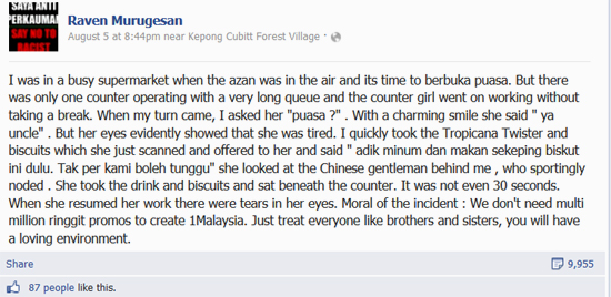 One of the heroes of this year’s bulan puasa was Raven Murugesan, a teacher who paused in a long supermarket queue to offer food and drink to a tired cashier who was due to break her fast. By the first day of Aidilfitri, Raven’s initial Facebook post had generated nearly 10,000 shares and was covered by The Star.