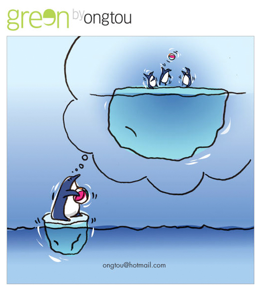 I think cartoons like this are negative. Are the penguins preoccupied with playing ball? Do they actually play on top of an iceberg? What message is the author trying to convey with this false and misleading information?