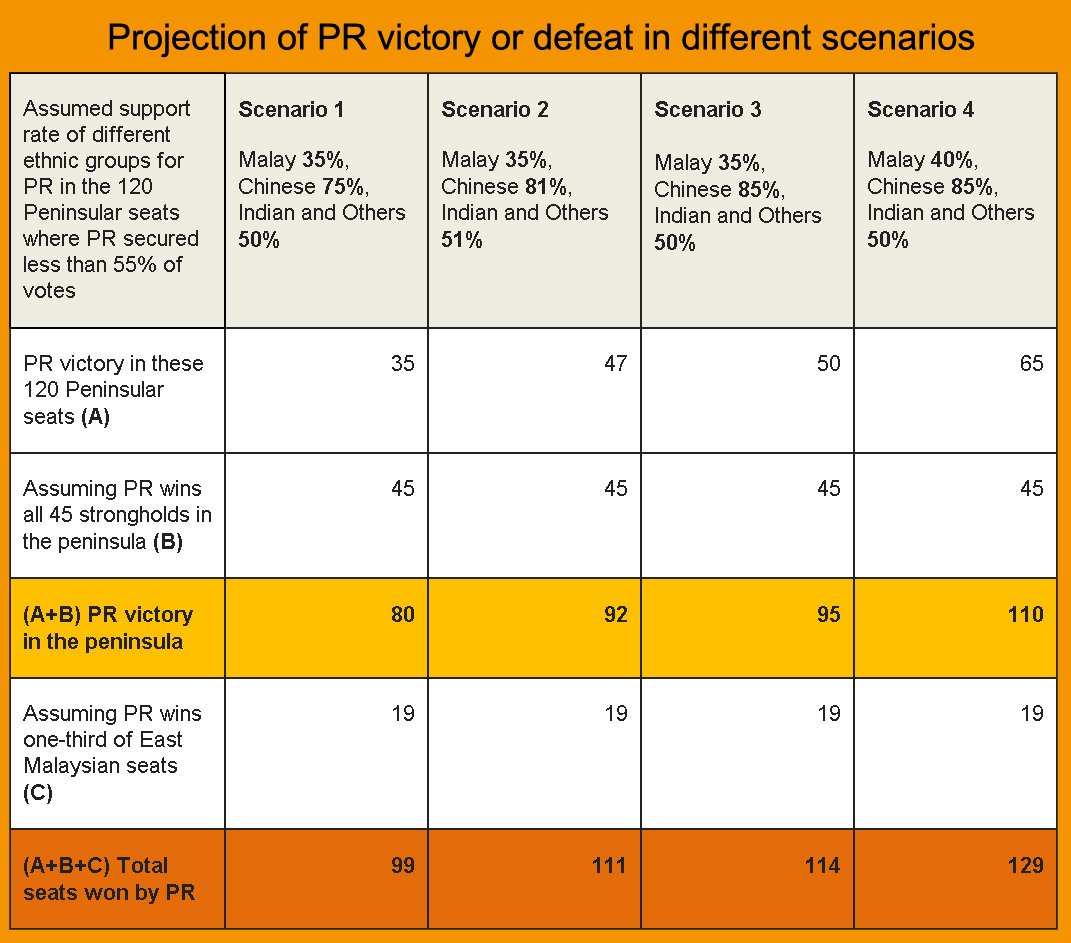 For the remaining 120 Peninsular seats, the PR won 35 seats with less than 55% of votes and lost 85 in 2008. Assuming this time that in these seats, there is 35% Malay Malaysian support, 75% Chinese Malaysian support and 50% Indian Malaysian and other ethnic groups’ support, the PR will win 35 seats in the peninsula, which would be status quo [1]. This is basically a scenario where the Chinese support is not as strong as expected.